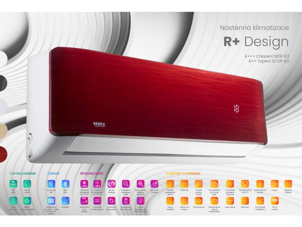 Klimatizace VIVAX R+ design ACP-12CH35AERI+ je nástěnná vnitřní jednotka. Je ideálním řešením pro klimatizaci obchodních nebo obytných prostor. Díky své energetické účinnosti splňují všechny uživatelské a prostorové požadavky na chlazení a vytápění. Vysoká energetická účinnost za všech povětrnostních podmínek je umožněna nejnovějšími technologickými řešeními a atraktivní design a nízká hladina hluku přispívají k příjemné atmosféře v každém prostoru. Biofiltr a ionizátor odstraňují znečišťující látky a alergeny ze vzduchu, díky čemuž je vzduch velmi čistý. Takový vzduch je velmi příznivý pro osoby citlivé na nečistoty ve vzduchu a pro lidi, kteří mají problémy s alergiemi. Vnitřní jednotka má samočisticí funkci, pokračuje v práci na sušení a čištění zbývajícího kondenzátu.